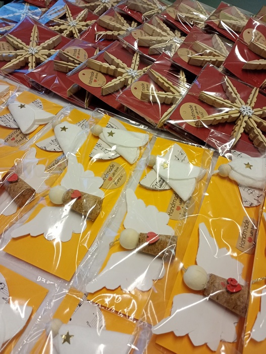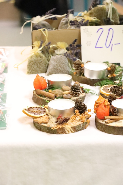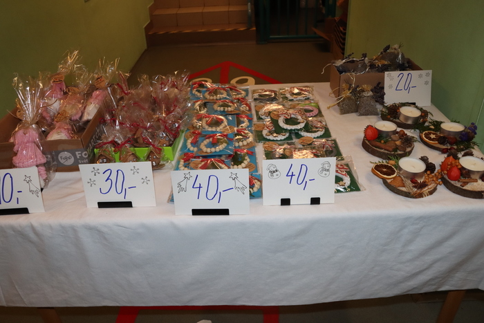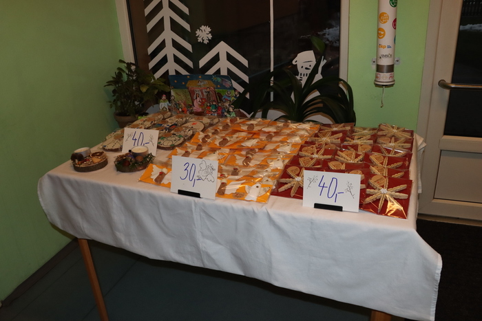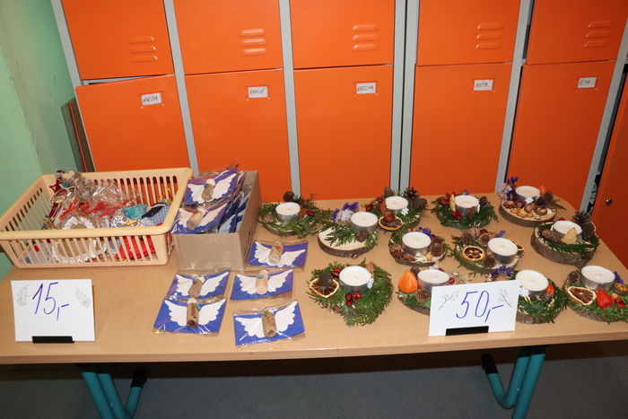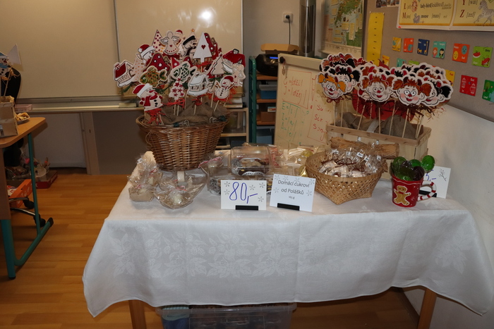 Návštěvníci si mohli zakoupit rukodělné výrobky našich žáků i učitelů, stejně jako krásné keramické produkty. Velký zájem byl také o preclíky, které pro tuto příležitost každým rokem peče náš dospělý školní kolektiv. K mání bylo i cukroví paní Poláškové, maminky žákyně z páté třídy, které tímto srdečně děkujeme. Nechybělo ani občerstvení a samozřejmě tradiční punč – pro malé i velké.