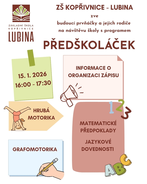 Setkáme se ve čtvrtek 15. ledna 2026 od 16:00 do 17:30 přímo v prostorách školy. Připraven bude přátelský program, během kterého si děti hravou formou vyzkouší, co je ve škole čeká – zaměříme se na hrubou motoriku, grafomotoriku, matematické předpoklady i jazykové dovednosti.